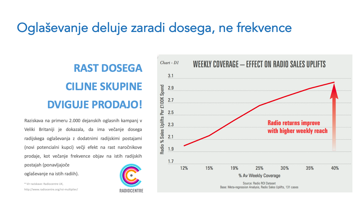 Učinkovitost radijskega oglaševanja (ROI) je večja z večjim dosegom kot večjo frekvenco objav!